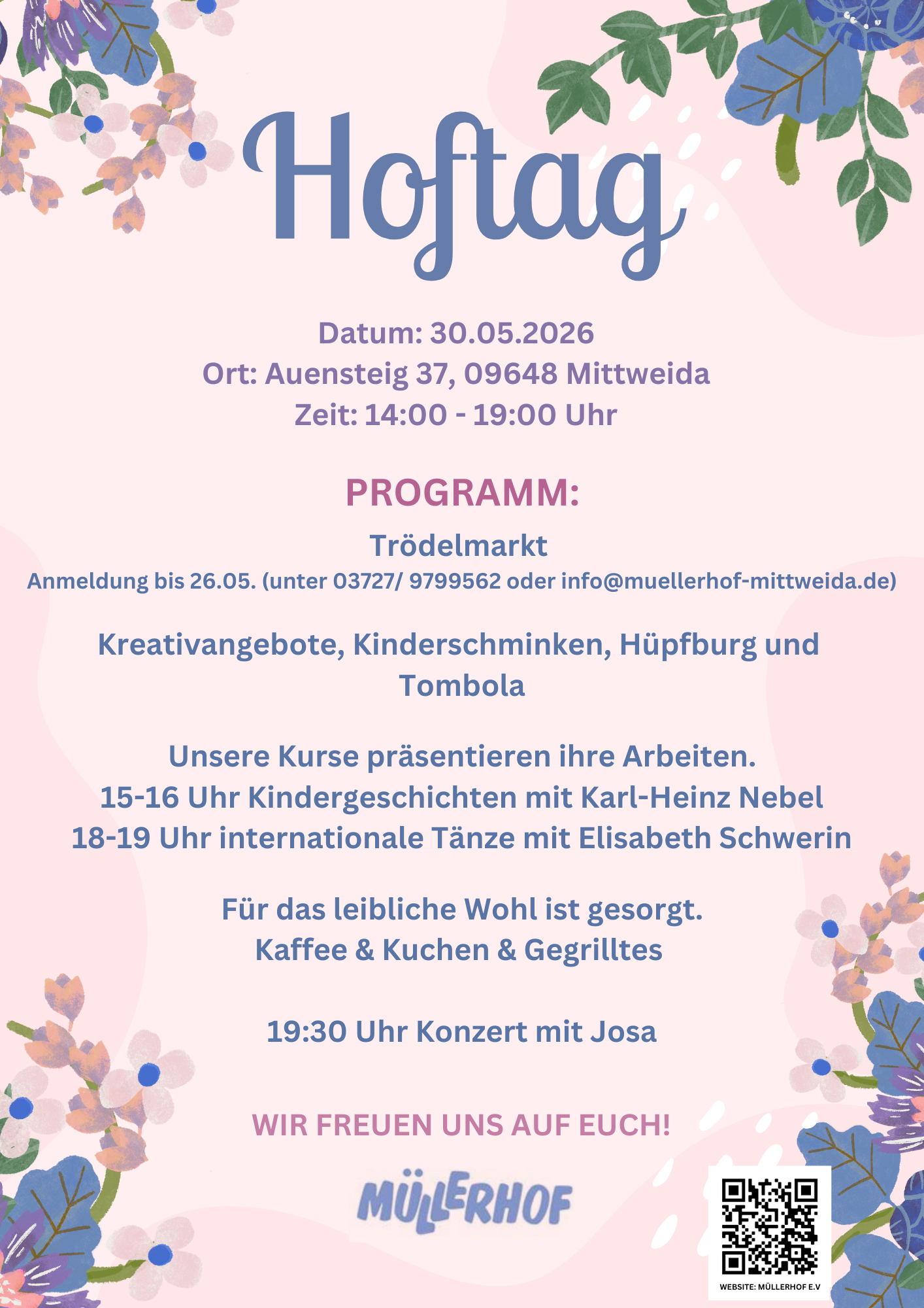 Unser Programmheft erscheint einmal im Quartal und informiert über das aktuelle Kursprogramm und einzelne Veranstaltungen und Projekte im Müllerhof e.V. Es ist erhältlich im Müllerhof, im Bürgerbüro der Stadt Mittweida und in vielen Läden. Manchmal ändern sich Kurszeiten. Deshalb achten Sie auch auf unsere Veröffentlichungen am Haus und in der regionalen Presse!